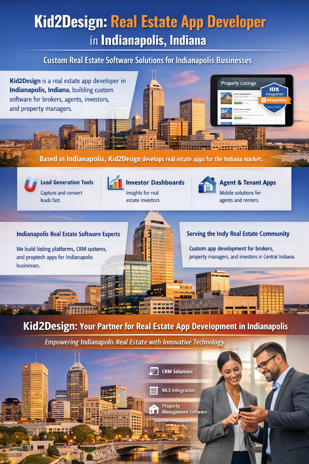 - Based in the Indianapolis area, Kid2Design builds custom real estate apps for businesses that need lead generation, listing management, CRM workflows, and property technology solutions.